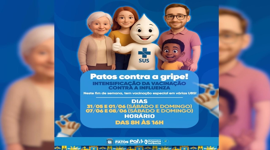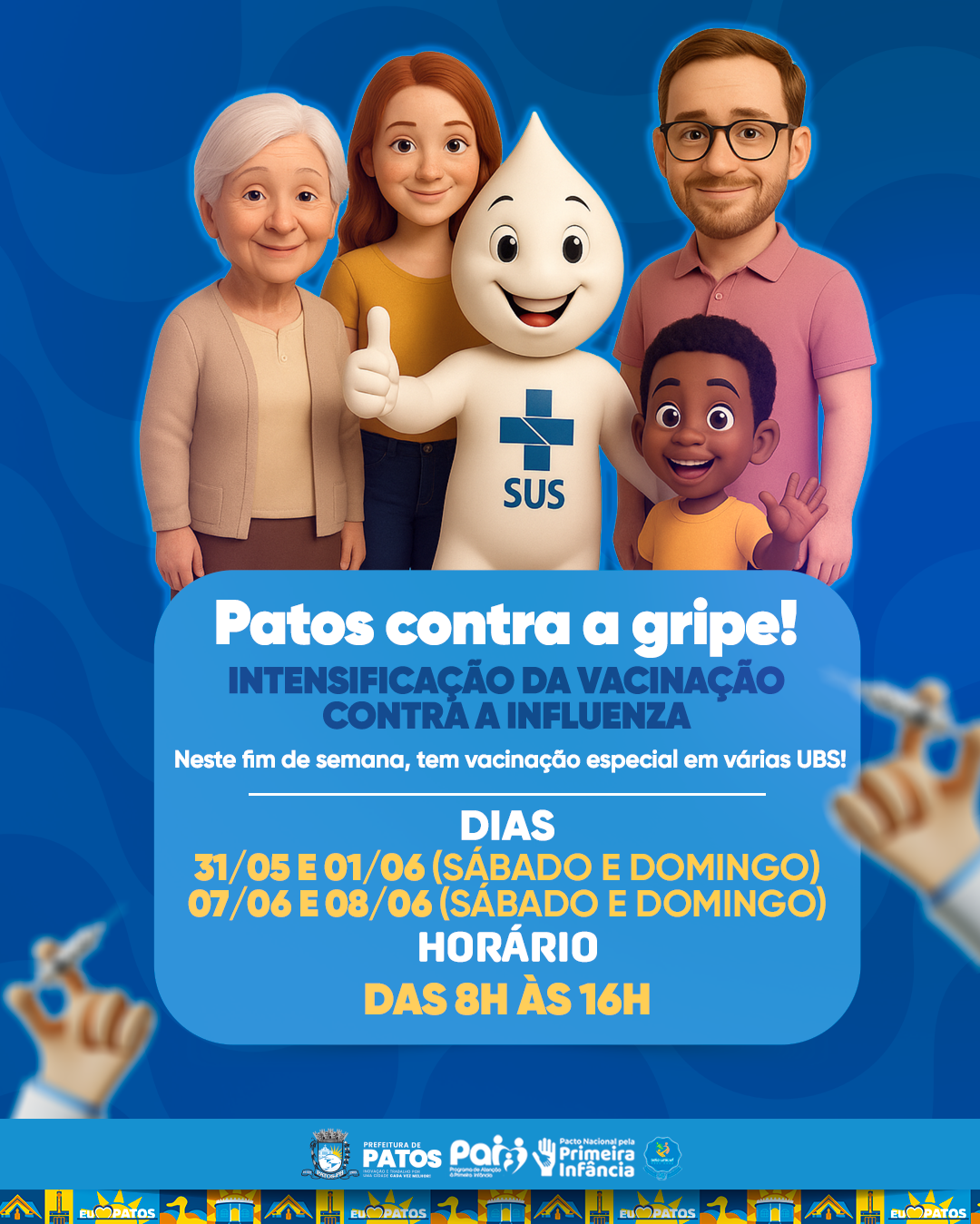 A Prefeitura de Patos, por meio da Secretaria Municipal de Saúde, está promovendo uma intensificação da campanha de vacinação contra a influenza (gripe), ampliando o acesso às doses por meio de atendimentos especiais aos finais de semana e em horários noturnos durante a semana. Vale lembrar que a vacinação está disponível para o público em geral a partir dos seis meses de idade.