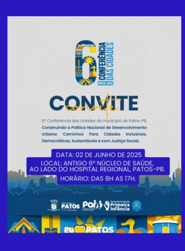 Nesta segunda-feira, dia 2 de junho, o município de Patos será palco da 6ª Conferência das Cidades, um evento de grande relevância para o planejamento e o desenvolvimento urbano da região. A conferência ocorrerá no antigo 6º Núcleo de Saúde, ao lado do Hospital Regional, das 8h às 17h.