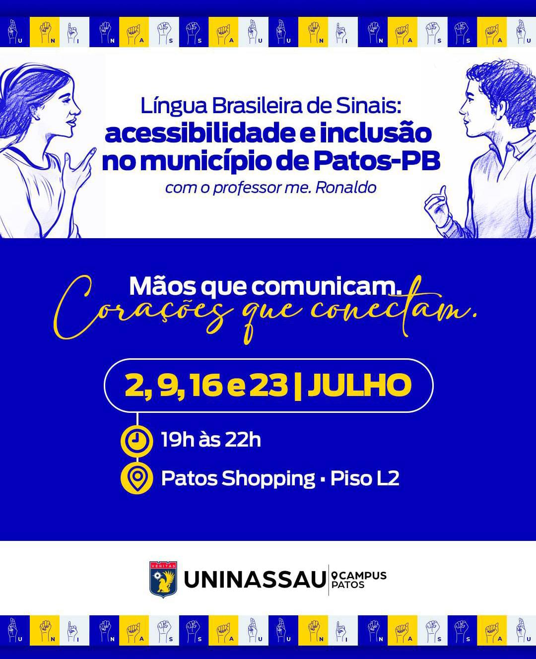 A unidade da UNINASSAU em Patos promoverá durante o mês de julho o Mês da Língua Brasileira de Sinais (Libras), com a realização de um minicurso gratuito todas as quartas-feiras, das 19h às 22h, no Patos Shopping.