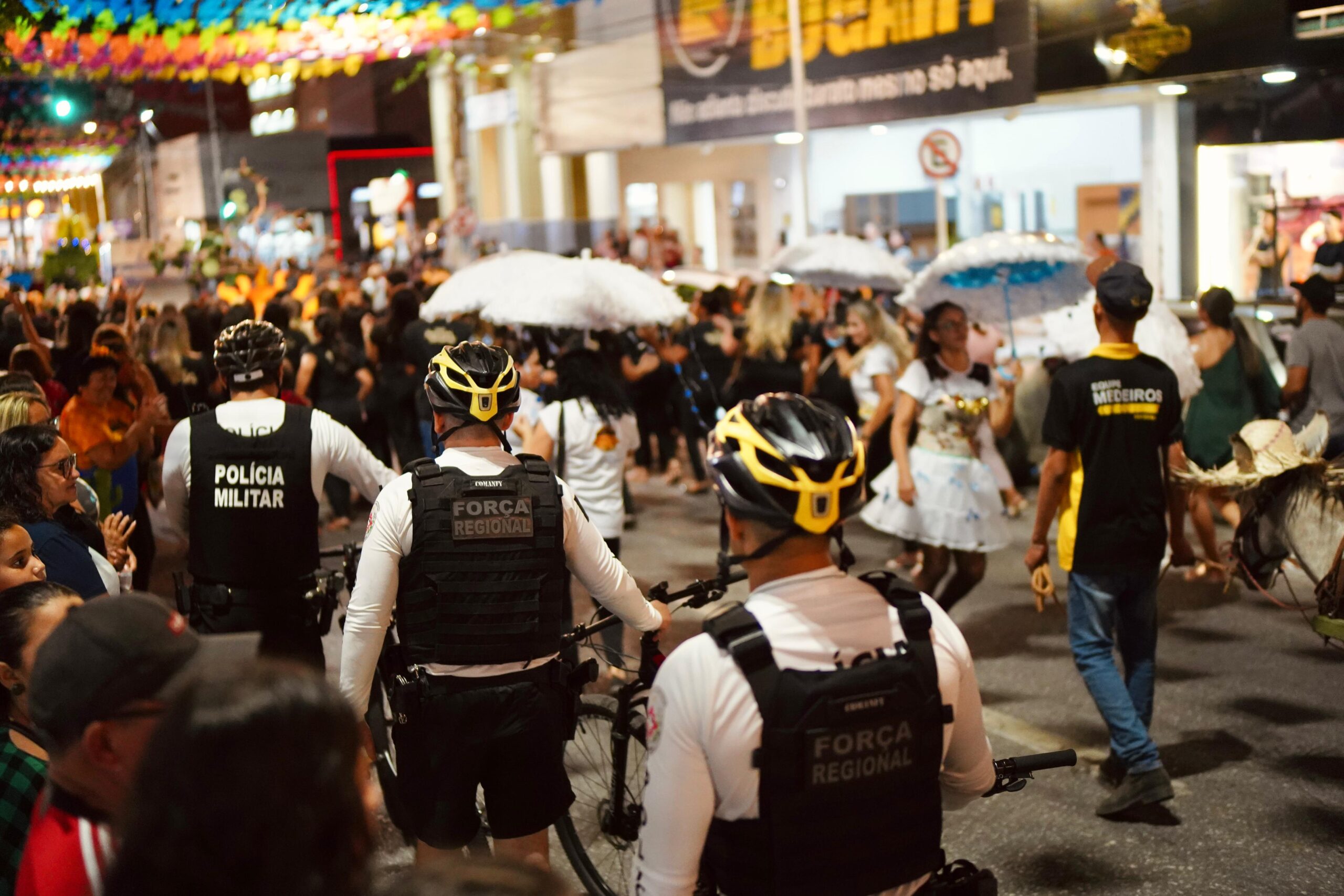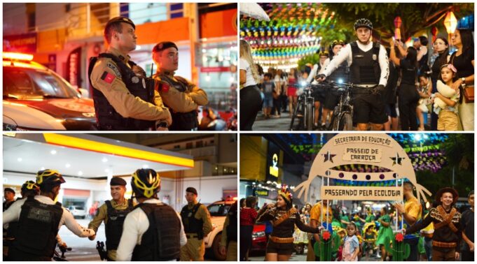 Foram mobilizadas viaturas em patrulhamento, ciclopatrulha e pontos-base ao longo do percurso, com supervisão direta do comandante do CPR II, Cel. Douglas, e do TC Esaú, comandante do 3º BPM. A atuação integrada reforça o compromisso da Polícia Militar com a preservação da ordem e a tranquilidade da população durante os festejos juninos.