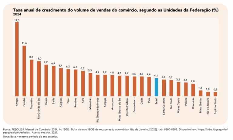 A Paraíba foi o segundo estado brasileiro a registrar maior crescimento do volume de vendas do comércio varejista no ano passado, de acordo com os Indicadores Econômicos do Brasil 2024, que foram divulgados pelo Instituto Brasileiro de Geografia e Estatística (IBGE) nessa última semana. Conforme a publicação, no acumulado de 2024, todas as Unidades da Federação registraram crescimento do volume de vendas do comércio varejista, sendo que os maiores ganhos foram observados no Amapá (17,0%), na Paraíba (11,6%) e no Tocantins (8,4%).