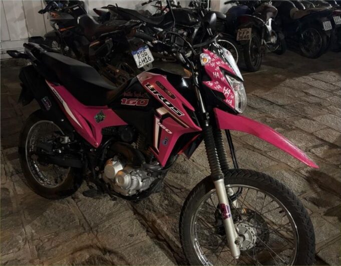 Durante patrulhamento ostensivo, as equipes visualizaram um indivíduo conduzindo uma motocicleta Honda Bros, de cor rosa, sem placa. Ao perceber a presença das viaturas, o condutor demonstrou nervosismo e, em seguida, empreendeu fuga, sendo localizado instantes depois.