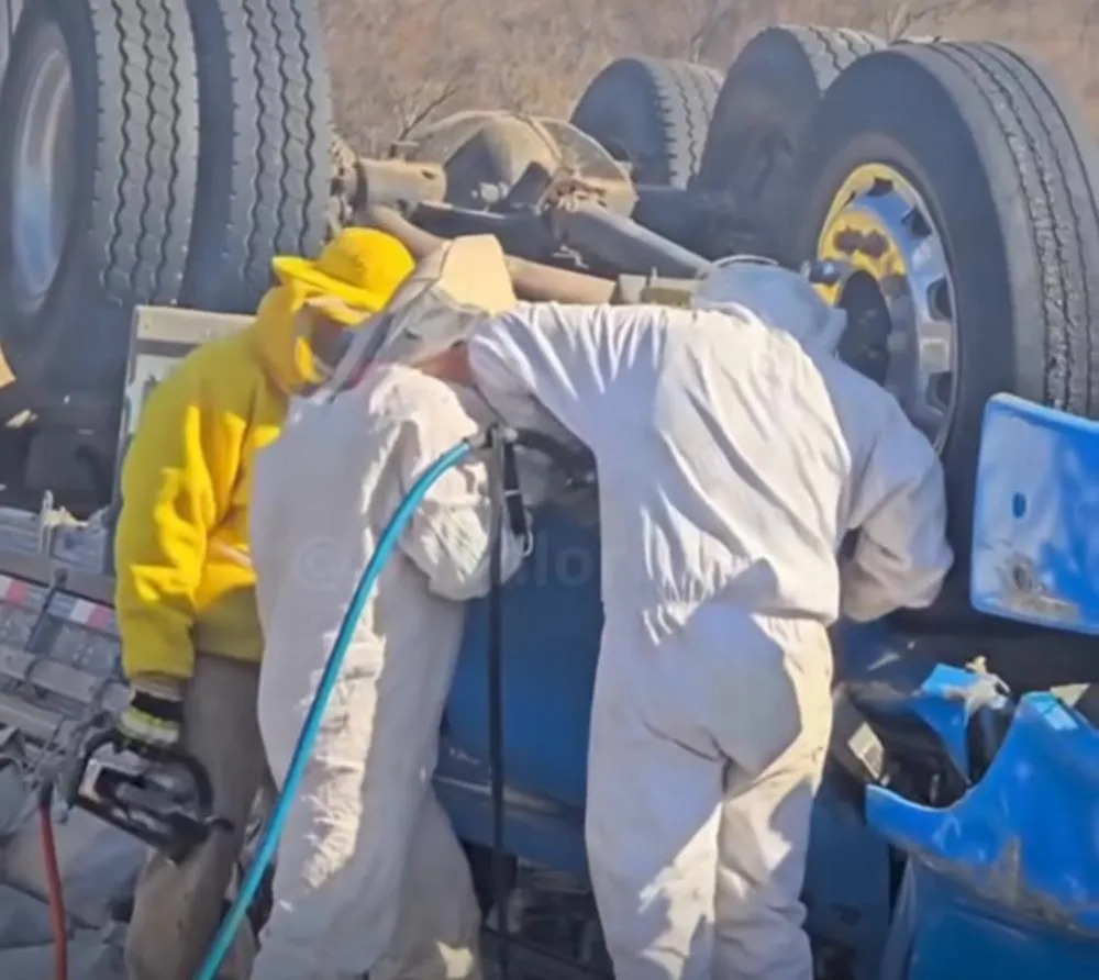 O tombamento de um caminhão Mercedes-Benz, que transportava cimento e tijolos, causou a morte de dois homens. As vítimas ficaram presas às ferragens, e o impacto do acidente agitou um enxame de abelhas, que passou a atacar os socorristas e pessoas próximas ao local.