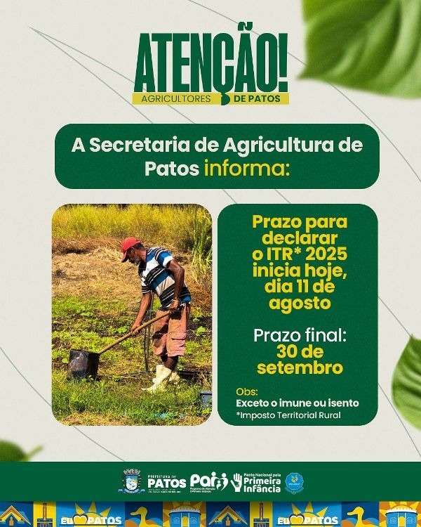 A Secretaria de Agricultura de Patos informa aos agricultores e agricultoras do município que inicia hoje, dia 11 de agosto, e vai até 30 de setembro o prazo para declaração do ITR 2025 (Imposto Territorial Rural), exceto o imune ou isento.