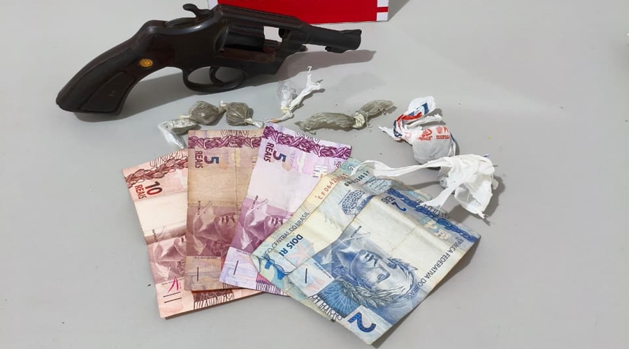 No interior do imóvel, foram localizados e apreendidos um revólver calibre .38, drogas, dinheiro em espécie e materiais utilizados para fracionamento e embalagem de entorpecentes.