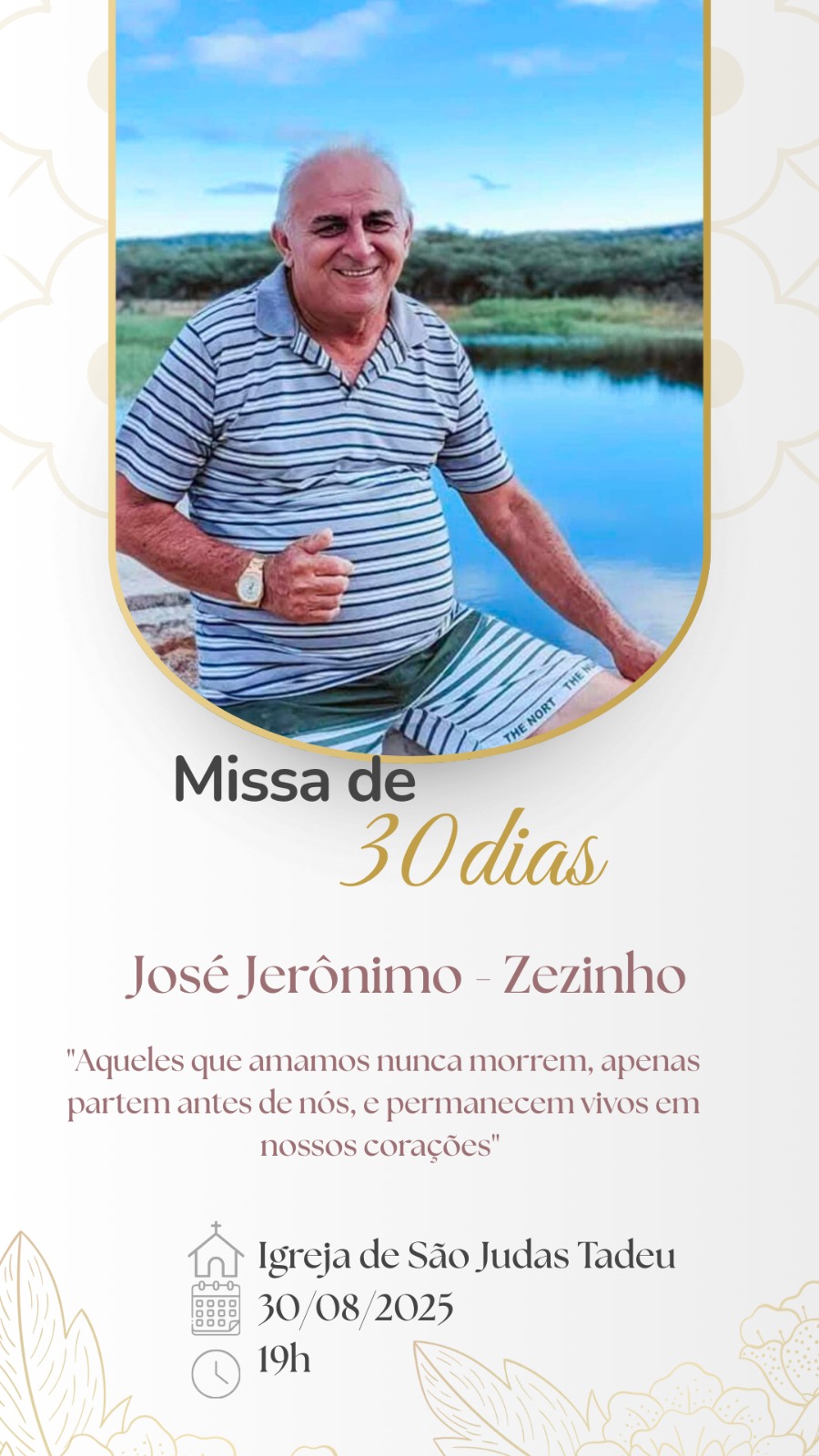 Os familiares do senhor José Jerônimo (Zezinho) convidam parentes e amigos para participarem da missa de 30º Dia, que acontecerá às 19h do próximo sábado, 30/08, na Igreja de São Judas Tadeu, na Vitória, em Patos.