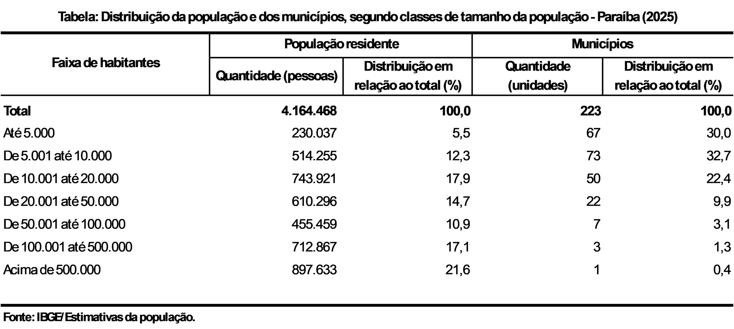 As Estimativas da População 2025 indicam que, na Paraíba, em apenas quatro municípios (1,7% dos 223 municípios do estado), vivem 1,61 milhão de pessoas, que correspondem a 38,7% da população paraibana. João Pessoa, com 21,6% (897,6 mil habitantes) da população estadual, é o único município da Paraíba com população superior a 500 mil habitantes. Nos outros três, com população na faixa de 100.001 a 500 mil habitantes, moram 17,1% da população paraibana (712,9 mil habitantes). São eles: Campina Grande, com 443.911; Santa Rita, com 160.852; e Patos, com 108.104 habitantes