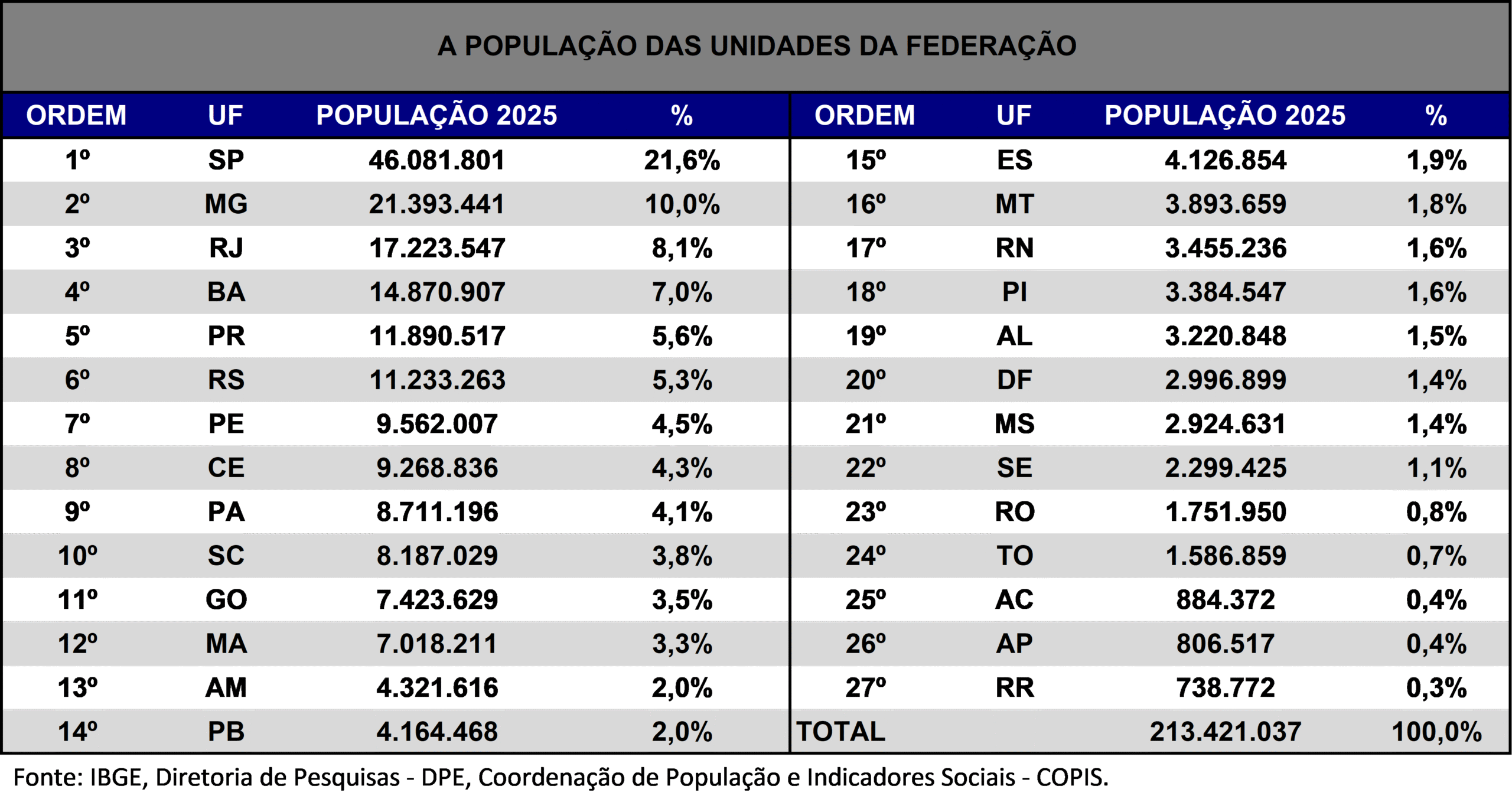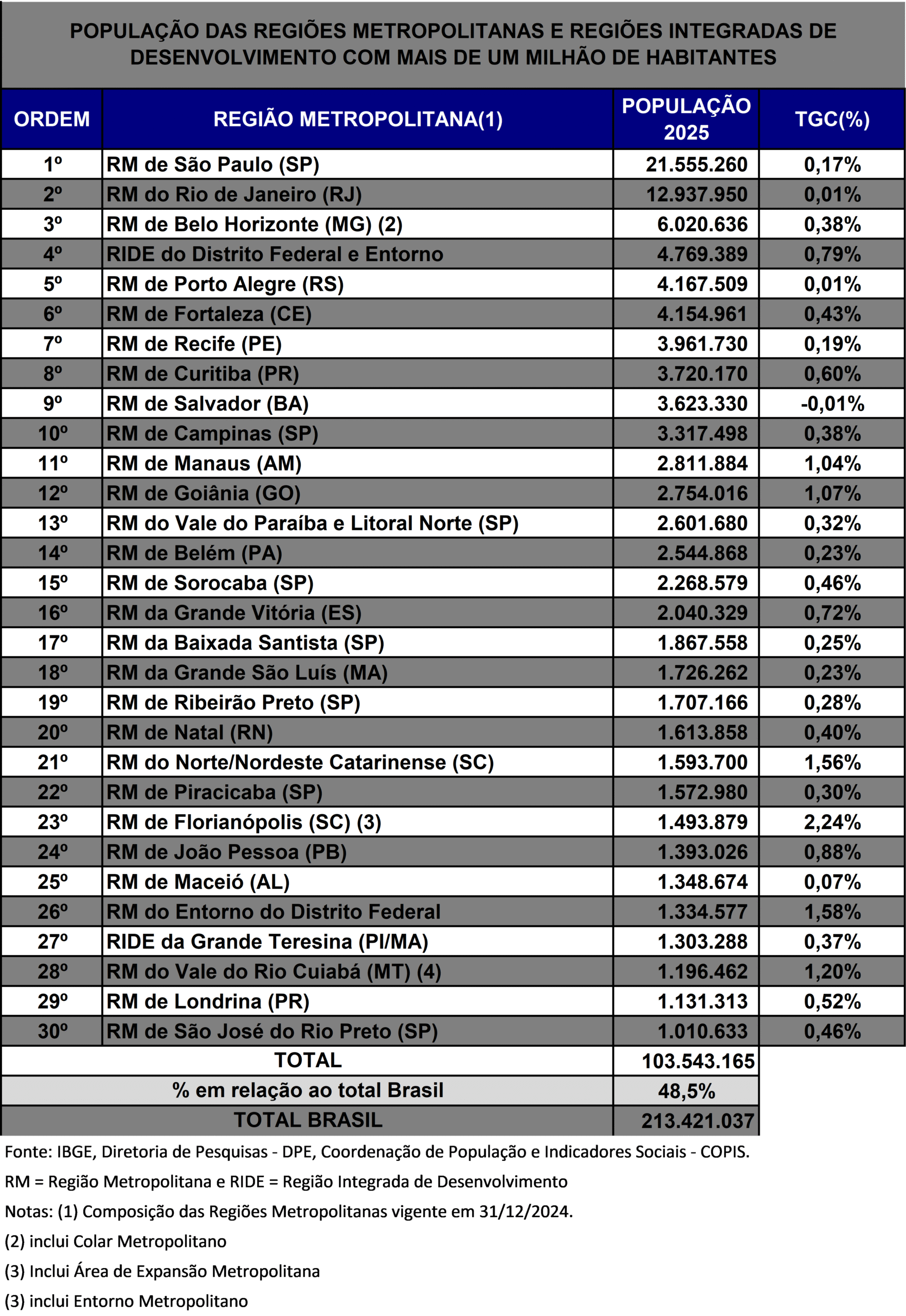 O estudo apresenta estimativas para o contingente populacional e a taxa de crescimento de todos os municípios do país para 2025, bem como para todas as unidades da federação, regiões metropolitanas e regiões integradas de desenvolvimento. As estimativas constituem um dos parâmetros utilizados pelo Tribunal de Contas da União (TCU) para o cálculo do Fundo de Participação de Estados e Municípios, além de referência para indicadores sociais, econômicos e demográficos no período entre os censos demográficos.