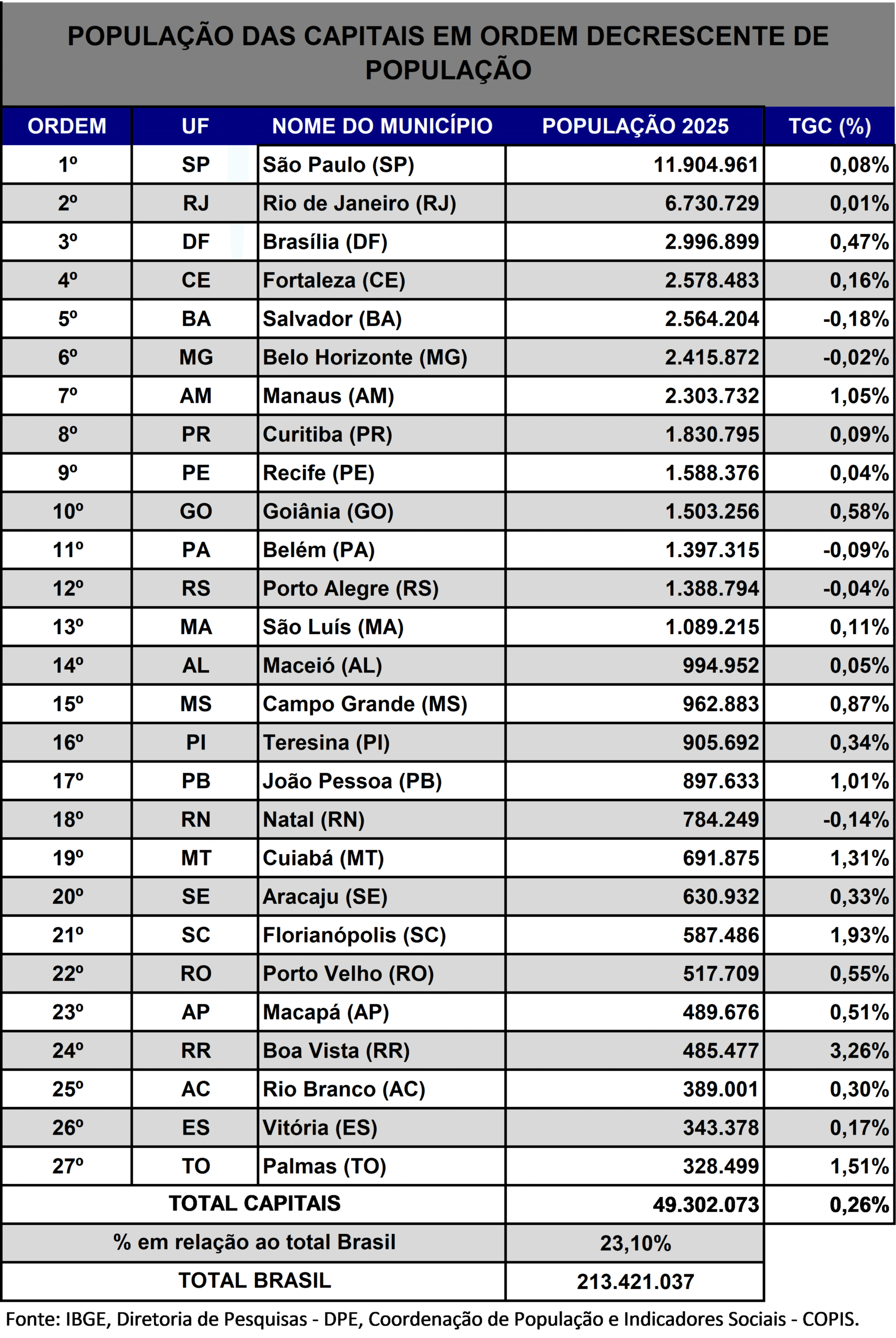 Já entre as capitais, que concentram 23,1% (49,3 milhões de pessoas) da população brasileira, João Pessoa aparece na 17ª posição no ranking das populações, com 897.633 habitantes; e com a 6ª posição no ranking das taxas de crescimento anual, com 1,01%.