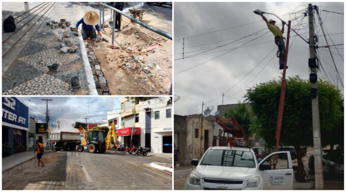 No centro da cidade, as equipes realizaram operação tapa-buraco e serviço de varrição no entorno da Praça Edvaldo Motta e na Travessa João Pessoa, importantes áreas de circulação de pedestres e veículos.