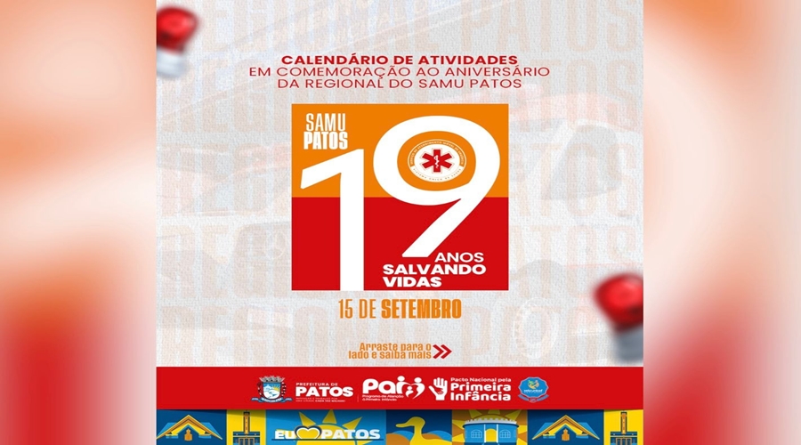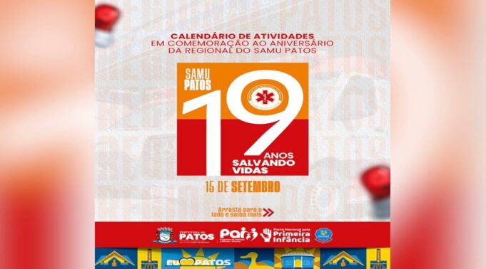 O Serviço de Atendimento Móvel de Urgência (SAMU 192 Regional de Patos) comemora, na próxima segunda-feira, 15 de setembro, seus 19 anos de implantação, ocorrida em 2006, durante a primeira gestão do então prefeito Nabor Wanderley. Para marcar a data, uma programação especial já teve início nesta quarta-feira (10) e seguirá até a próxima sexta-feira (12), com palestras, capacitações e atividades educativas voltadas a profissionais da saúde, segurança e à população.