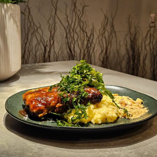 Outro destaque é a Costelinha Suína ao Barbecue de Rapadura, cozida por seis horas no sous-vide e servida com um risoto de queijo de manteiga com nata — um casamento entre técnica moderna e ingredientes do sertão.