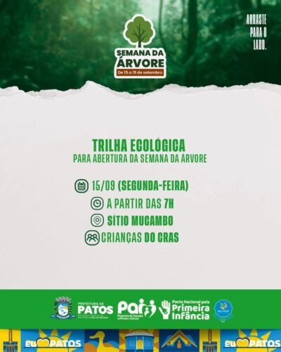 A Prefeitura Municipal de Patos, por meio da Secretaria de Meio Ambiente e Desenvolvimento Sustentável (SEMADS), anuncia a realização da Semana da Árvore, que ocorrerá de 15 a 19 de setembro de 2025. A iniciativa visa promover a reflexão e a ação em prol da preservação ambiental, da arborização urbana e da valorização dos ecossistemas locais.