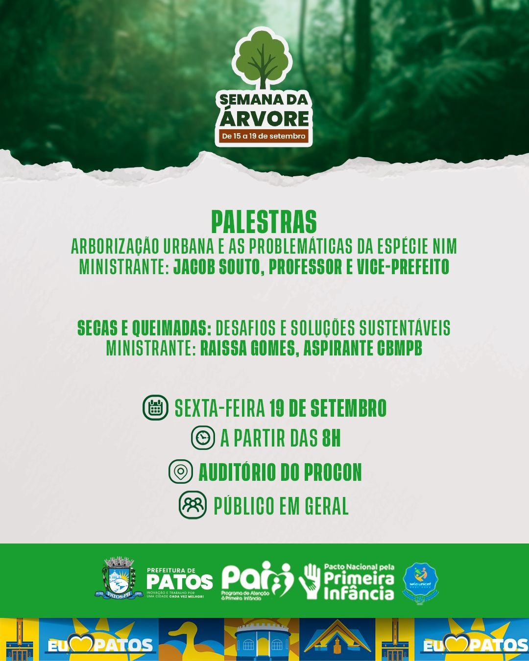 Palestras Institucionais: O encerramento da semana será marcado por palestras abertas ao público, que ocorrerão na sexta-feira, 19 de setembro, no auditório do PROCON. Os temas abordados serão “Arborização Urbana e as problemáticas da espécie Nim” e “Secas e Queimadas: desafios e soluções sustentáveis”, ministradas pelo professor e vice-prefeito de Patos, Jacob Souto, e Raissa Gomes, aspirante do CBMPB.