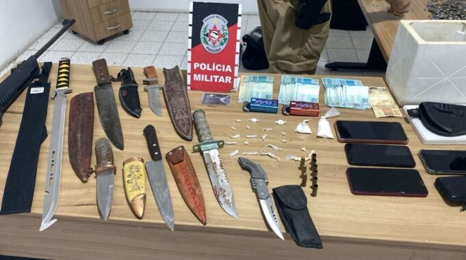 No local, foram apreendidos entorpecentes do tipo crack e cocaína, além de dinheiro, uma arma de pressão, diversas facas, punhais, peixeiras, uma espada e várias munições de arma de fogo (foto).