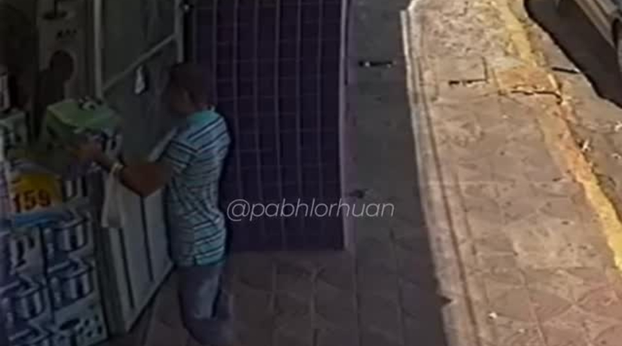 Nas imagens, é possível ver que o suspeito usa camisa listrada, short cinza, sandálias brancas e carrega uma sacola. Ele se aproxima da entrada da loja, observa o movimento e, em um momento de distração dos funcionários, pega o produto e sai caminhando tranquilamente.