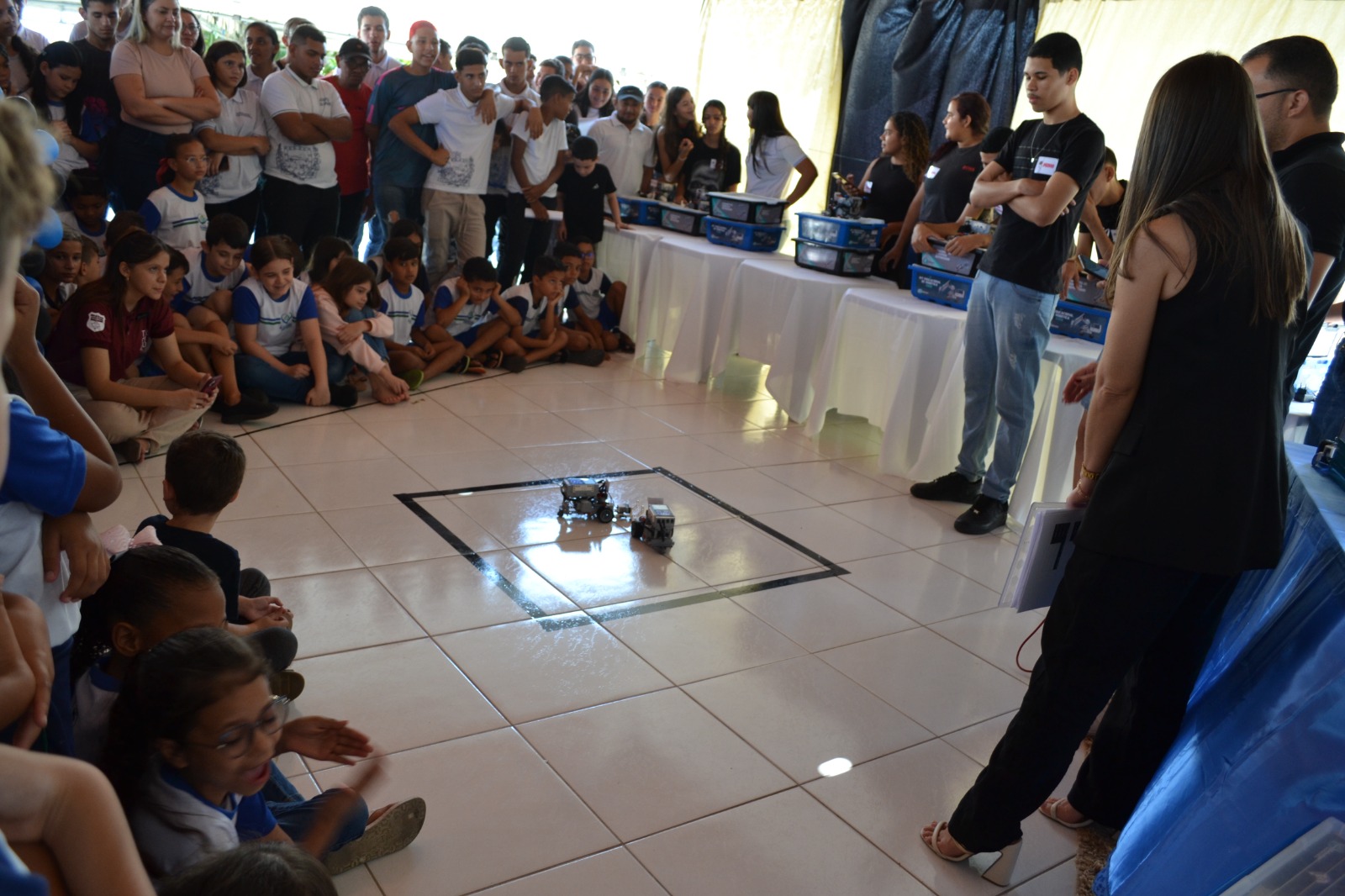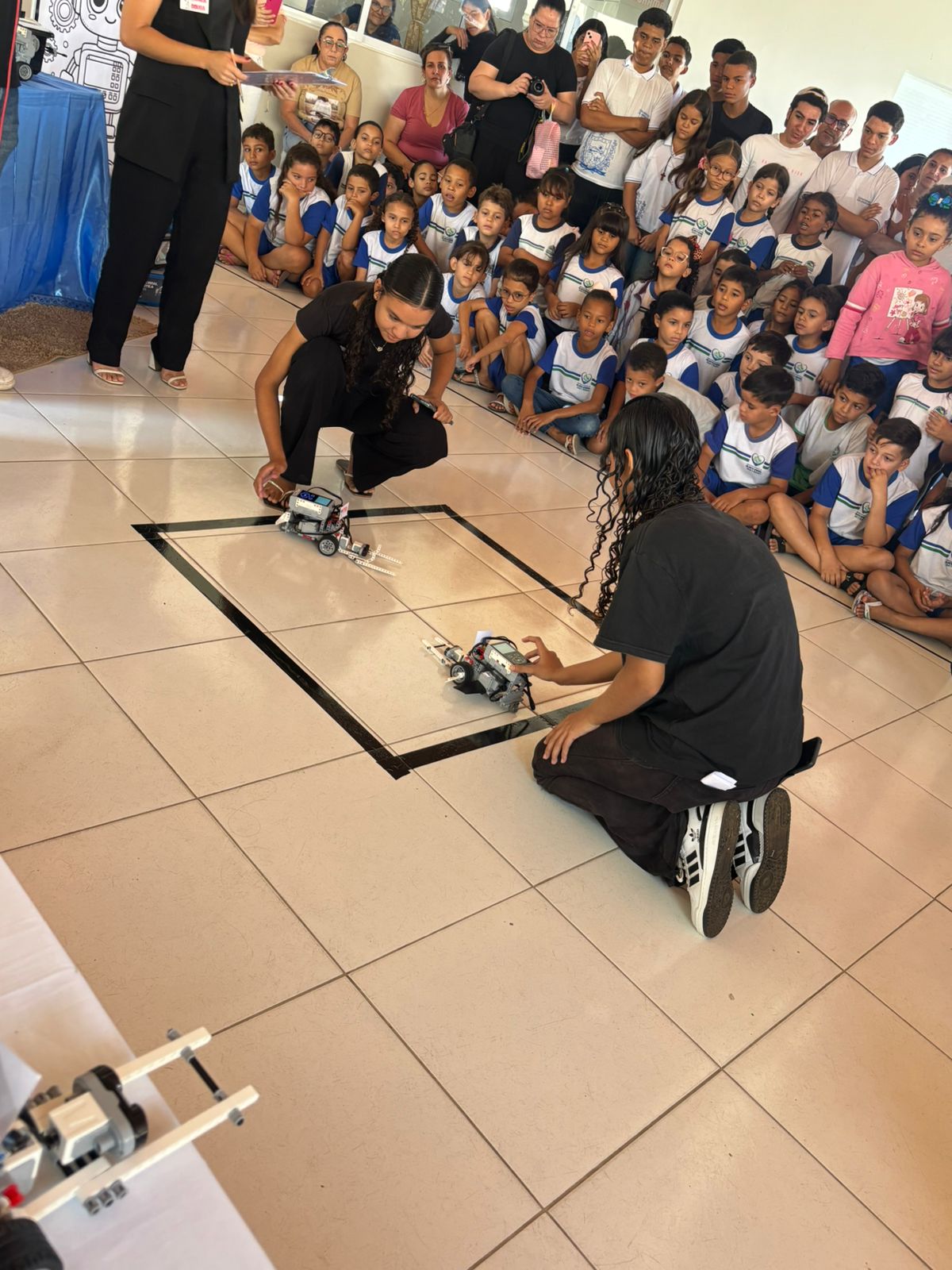 O projeto aconteceu na praça Bossuet Wanderley, no centro da cidade, com o objetivo de despertar o interesse e desmistificar a Física para os alunos do ensino médio, tornando-a uma disciplina mais acessível e prática, utilizando a robótica como uma ferramenta para que os estudantes aplicassem os conceitos teóricos de maneira lúdica e concreta, estimulando o desenvolvimento de habilidades essenciais como a resolução de problemas, o trabalho em equipe e a criatividade.
