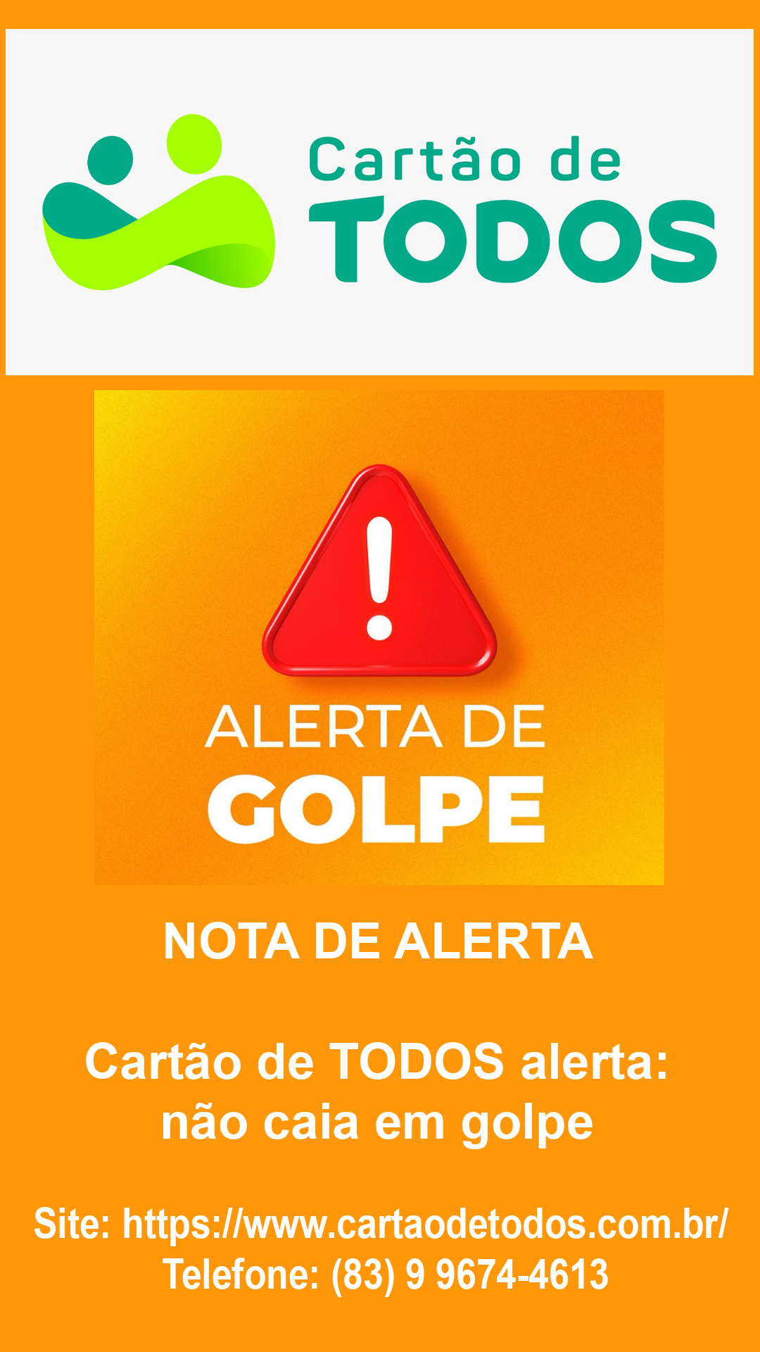 Este comunicado está sendo divulgado pois, recentemente, identificamos que estão sendo feitos contatos com a população afirmando de maneira enganosa que o Cartão de TODOS teria alterado a sua identidade e por isso seria necessário contratar outro cartão de descontos.