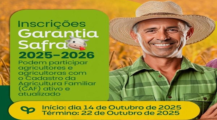 A Prefeitura de Patos, por meio da Secretaria de Agricultura, informa aos agricultores e agricultoras familiares do município que as inscrições do Garantia-Safra 2025-2026 terão início no próximo dia 14 de outubro e ocorrerão até o dia 22 de outubro.