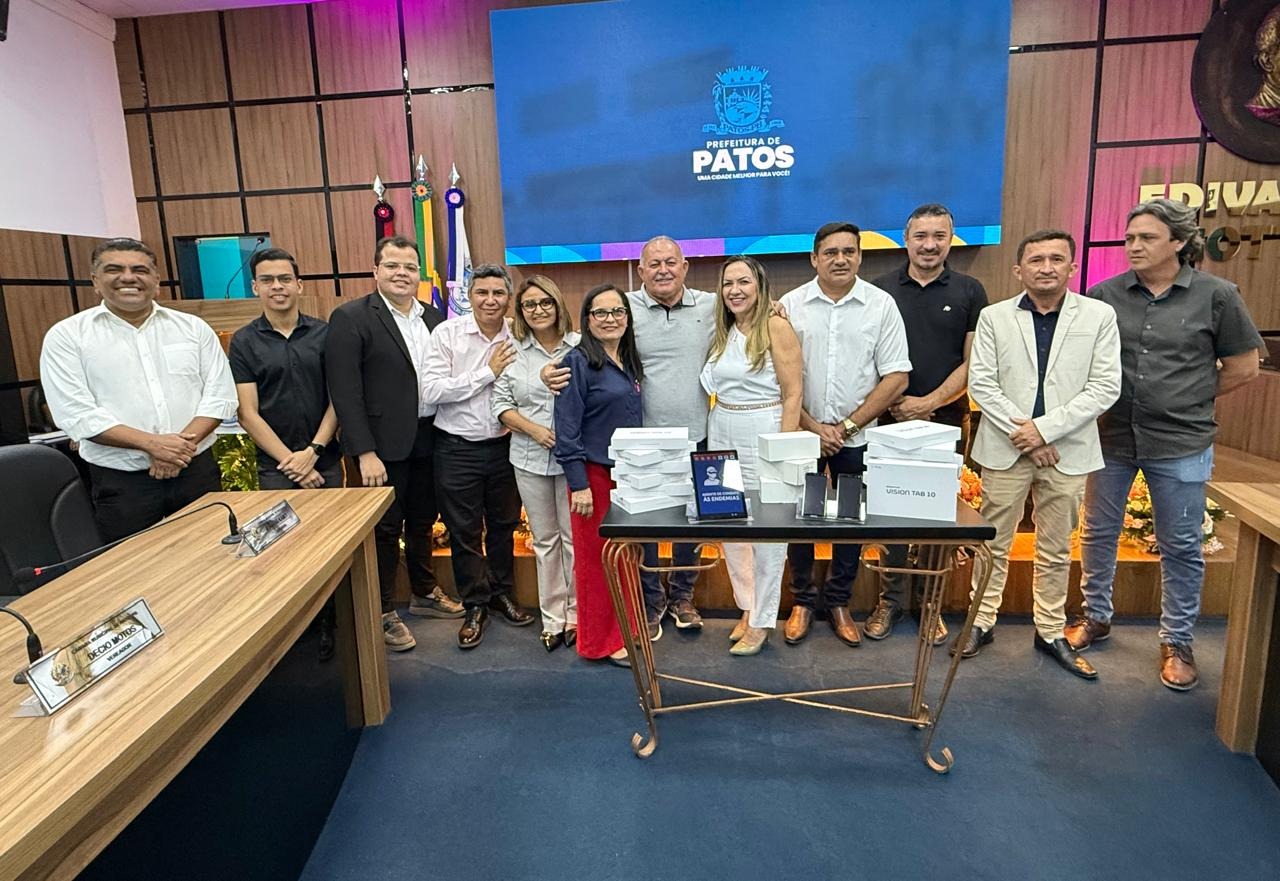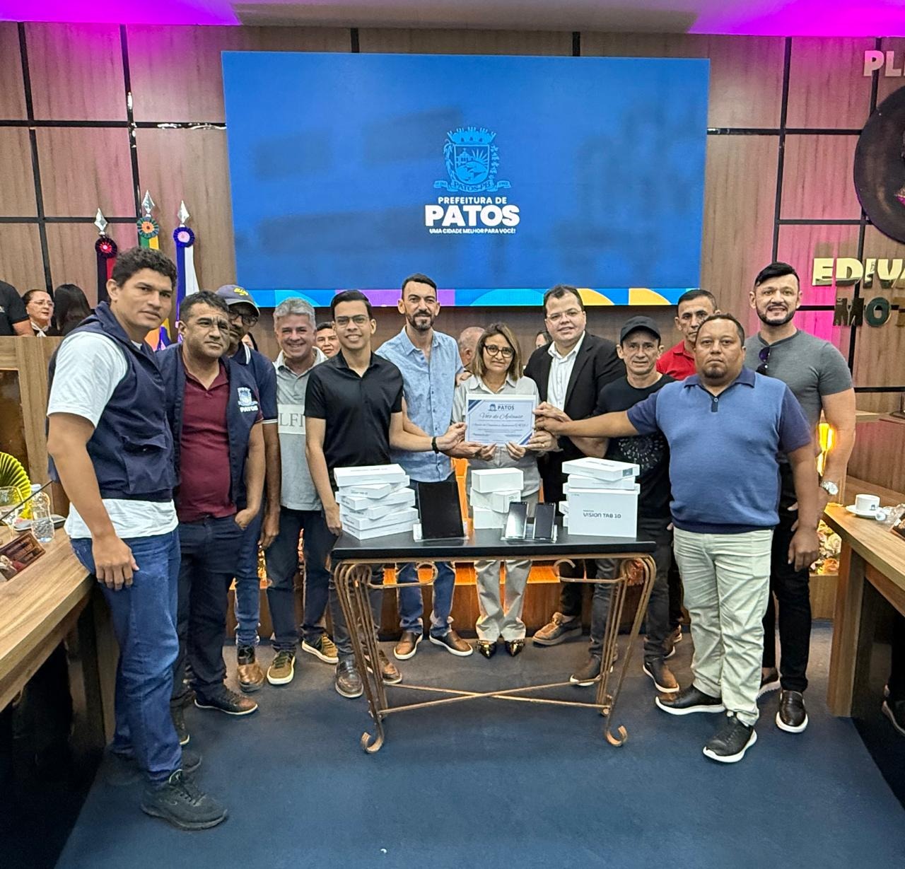A Prefeitura de Patos, por meio da Secretaria Municipal de Saúde, realizou na manhã desta sexta-feira (3), na Câmara de Vereadores, mais uma ação dentro da programação alusiva aos 122 anos de elevação de Patos à categoria de cidade. Na ocasião, foram entregues tablets, uniformes, protetores solares, botas e outros equipamentos de proteção individual aos agentes de combate às endemias (ACEs), além de celulares destinados às coordenações de saúde.