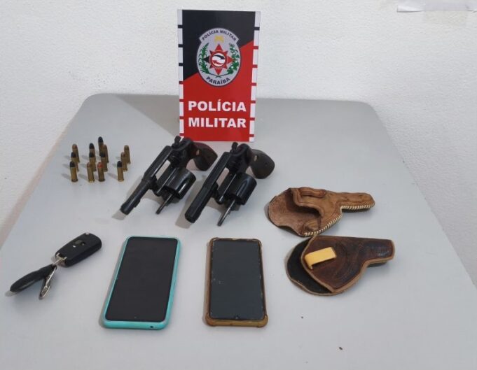 Ao chegarem ao local, os policiais militares identificaram o automóvel, cujo condutor tentou evadir-se ao perceber a presença das guarnições. Após acompanhamento e abordagem, foi constatado que os suspeitos portavam duas armas de fogo — dois revólveres calibre .38 — além de 13 munições e outros objetos no interior do veículo.