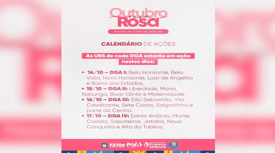 Durante todo o mês de outubro, as Unidades Básicas de Saúde (UBS) de Patos realizam ações voltadas à saúde da mulher, reforçando a importância da prevenção e do diagnóstico precoce do câncer de mama e do colo do útero.