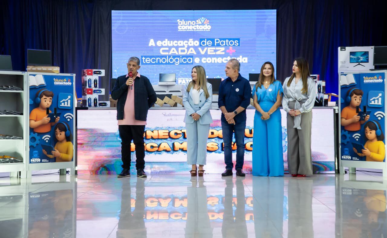 A Prefeitura de Patos, por meio da Secretaria Municipal de Educação, lançou na noite desta terça-feira, 14 de outubro, o Programa Aluno Conectado, durante uma solenidade especial em comemoração ao Dia do Professor. O evento aconteceu no Patos Walter Play e reuniu diretores, professores, coordenadores pedagógicos, além do prefeito Nabor Wanderley, do vice-prefeito e professor Jacob Souto, e da secretária de Educação, Adriana Carneiro.