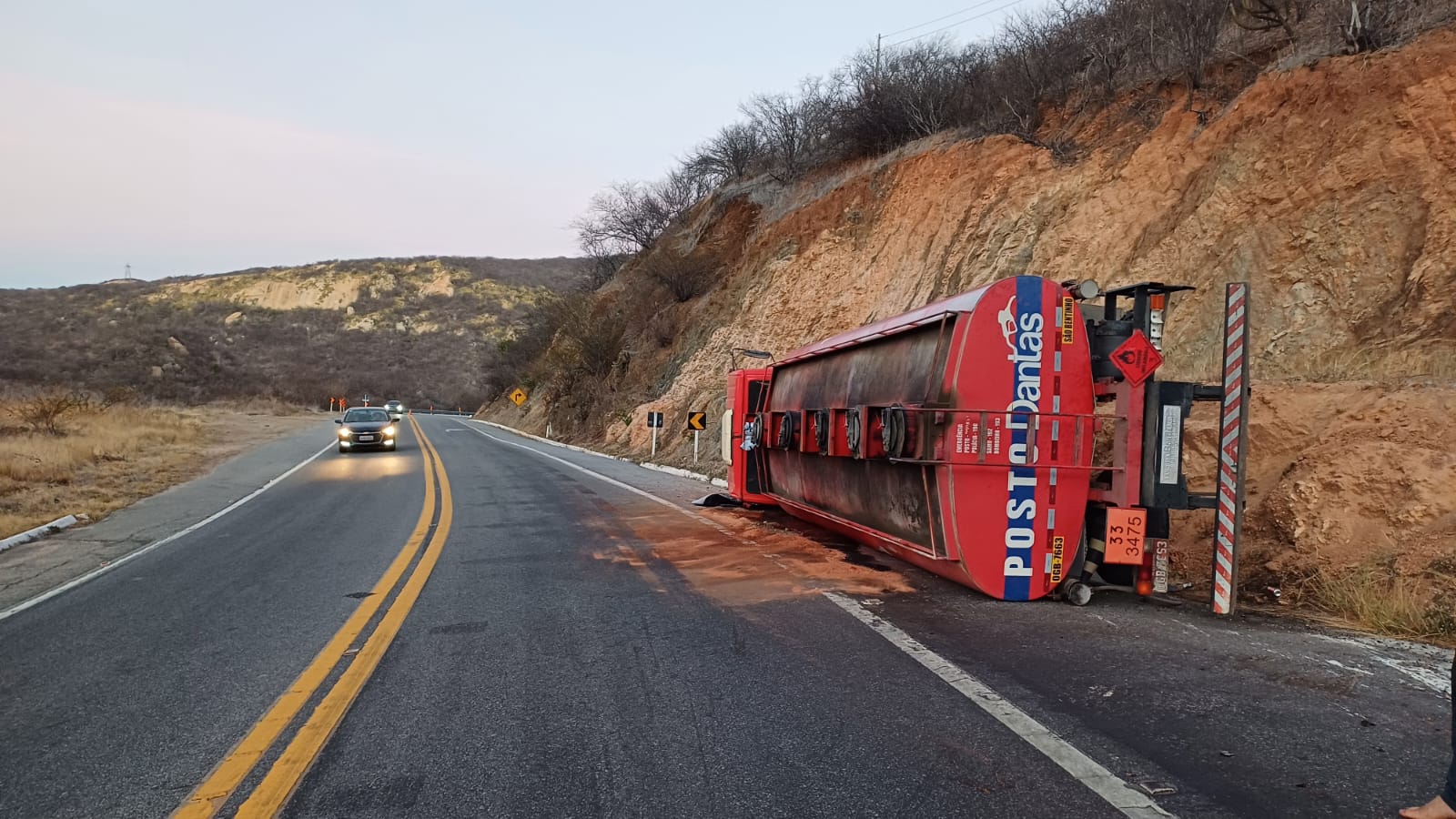 Um caminhão-tanque M.Benz/Atron 232 tombou por volta das 3h01 da madrugada desta quinta-feira (23), no final da Serra de Santa Luzia, na Região Metropolitana de Patos, no km 278 da BR-230, sentido Campina Grande–Patos. O veículo seguia com destino ao município de São Bentinho quando o motorista perdeu o controle em uma das curvas e acabou tombando.