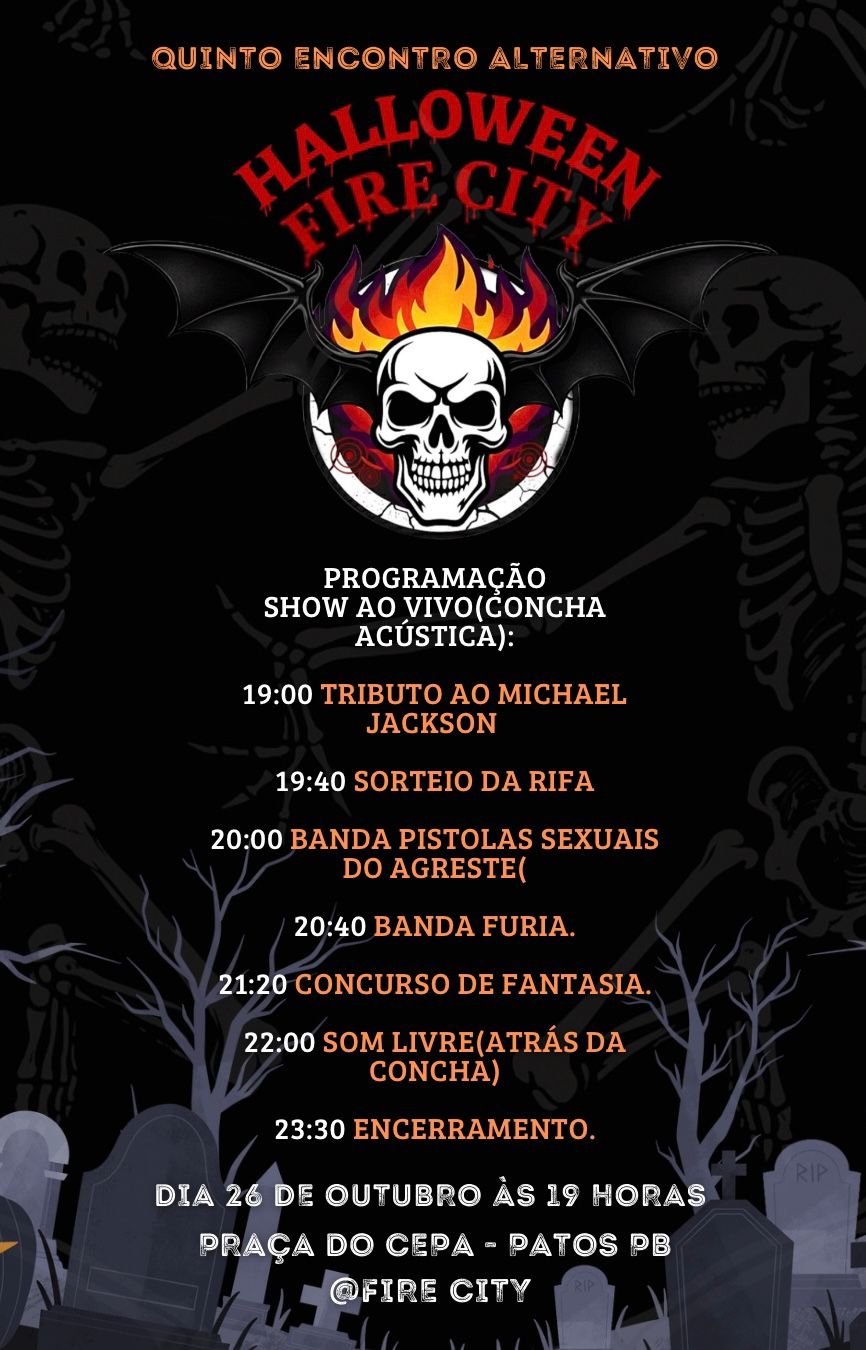 No próximo domingo, dia 26 de outubro, a cidade de Patos será tomada pelo espírito do rock e pelas cores do Halloween. A partir das 19h, acontece a 5ª edição do Halloween do Fire City, evento que vem se consolidando como um dos principais movimentos de rock da região. A programação segue até as 23h, reunindo bandas, fãs e apoiadores da cena musical local.