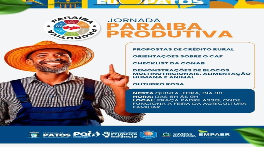 De iniciativa da Empresa Paraibana de Pesquisa, Extensão Rural e Regularização Fundiária (Empaer)/gerência regional Patos, da Secretaria do Desenvolvimento e da Pesca da Paraíba, será realizada, nesta quinta-feira, dia 30 de Outubro, mais uma edição da Jornada Paraíba Produtiva.