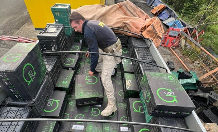 A ação ocorreu por volta das 16h, quando uma equipe da PRF abordou um caminhão Ford Cargo, de cor prata, no km 69 da rodovia. Durante a vistoria, os policiais observaram que o compartimento de carga continha algumas caixas plásticas de transporte, sob as quais estavam escondidas diversas caixas de papelão contendo cigarros da marca GIFT, de origem estrangeira.