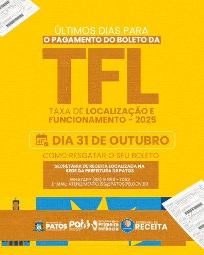A Prefeitura de Patos, por meio da Secretaria Municipal de Receita de Patos comunica a todos os contribuintes que o prazo final para o pagamento da Taxa de Localização e Funcionamento (TLF), mais conhecida como renovação do alvará de funcionamento, se encerra na sexta-feira, 31 de outubro.