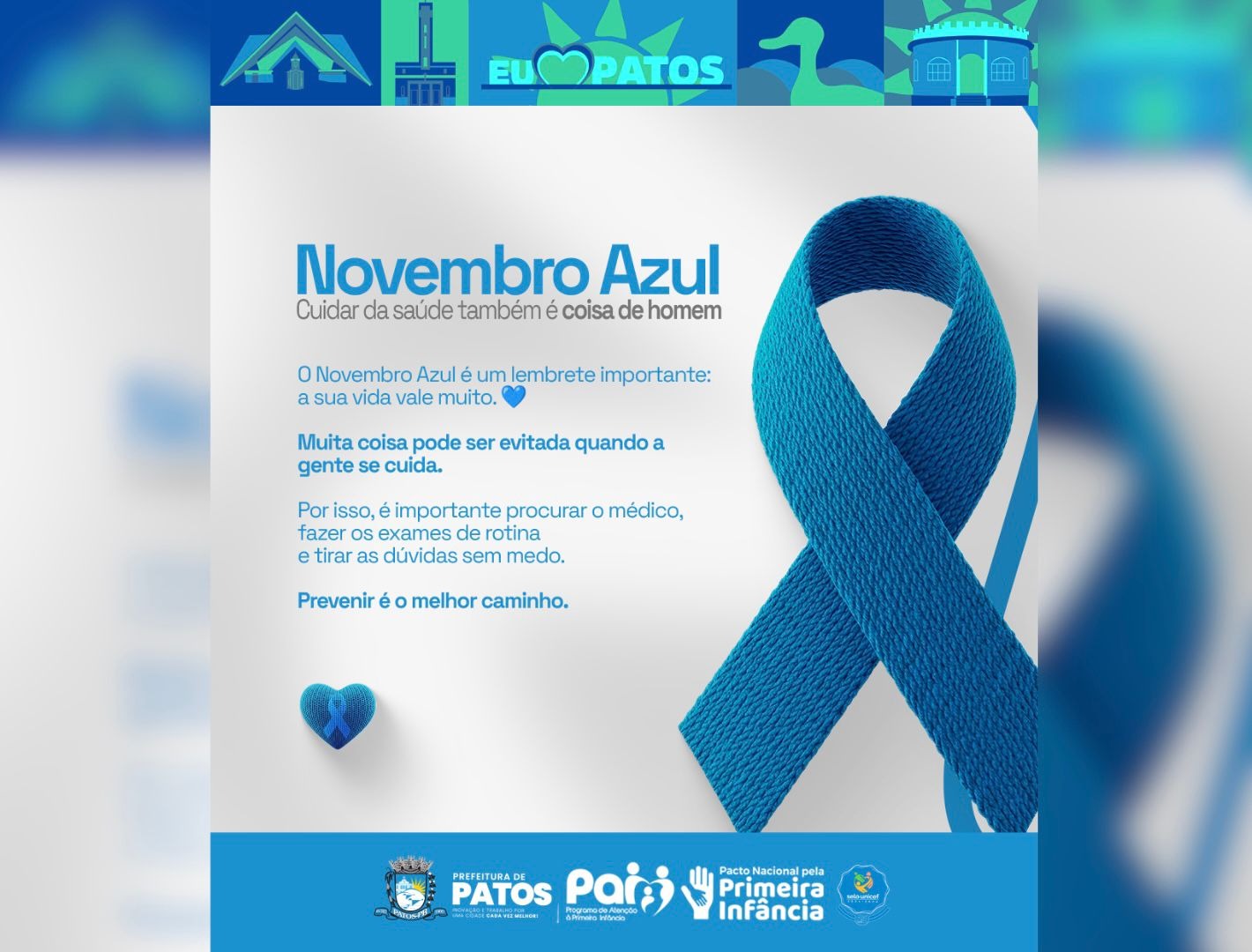 A Prefeitura de Patos, por meio da Secretaria Municipal de Saúde, dará início às ações do Novembro Azul, campanha de conscientização sobre a saúde do homem, com atividades educativas, avaliações de saúde, orientações e solicitação de exames. O objetivo é reforçar a importância do diagnóstico precoce e do cuidado preventivo, especialmente no que diz respeito ao câncer de próstata e outras doenças que afetam a população masculina.