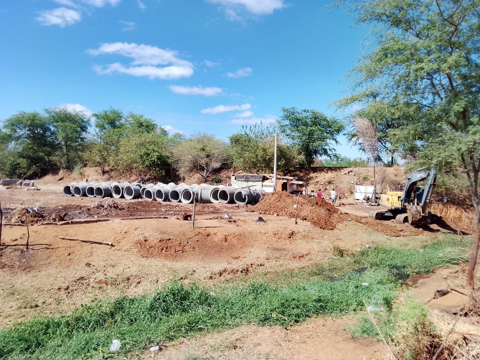 No bairro Salgadinho, equipes prepararam o solo para instalação de novas manilhas de concreto destinadas ao conserto da galeria de águas pluviais, além de avançarem na abertura da Rua Inácio Ferreira de Lucena.