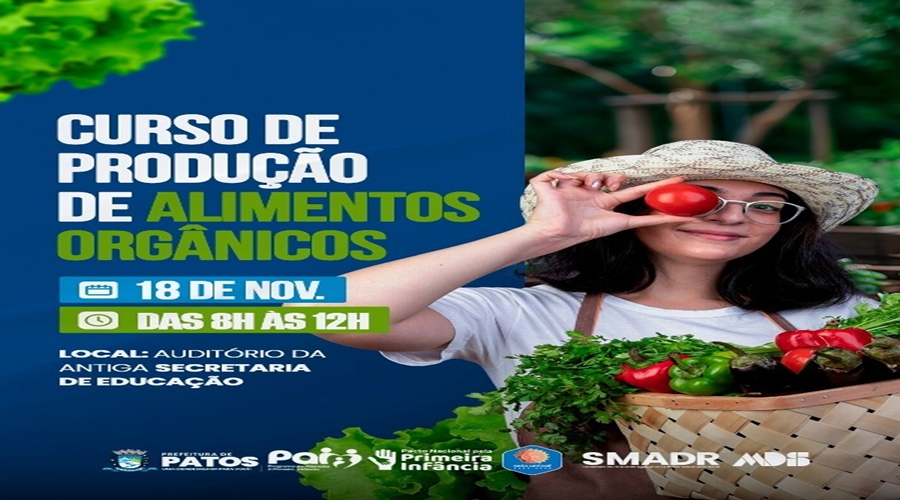 A Secretaria de Agricultura de Patos, juntamente com o Ministério do Desenvolvimento e Assistência Social Familiar e Combate à Fome, realiza, nesta terça-feira, dia 18 de novembro, o curso de produção de alimentos orgânicos.
