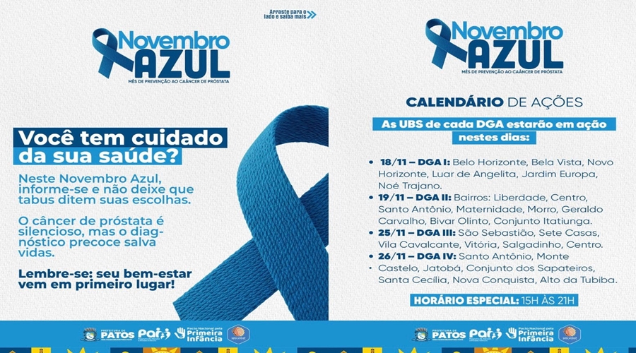 A Secretaria Municipal de Saúde de Patos inicia, nesta terça-feira (18), a programação oficial do Novembro Azul, mês dedicado à prevenção e ao diagnóstico precoce do câncer de próstata e ao cuidado integral da saúde do homem. Todas as Unidades Básicas de Saúde (UBS) do município funcionarão em dias específicos, conforme a área de abrangência de cada DGA, com horário estendido das 15h às 21h para ampliar o acesso da população masculina aos serviços.