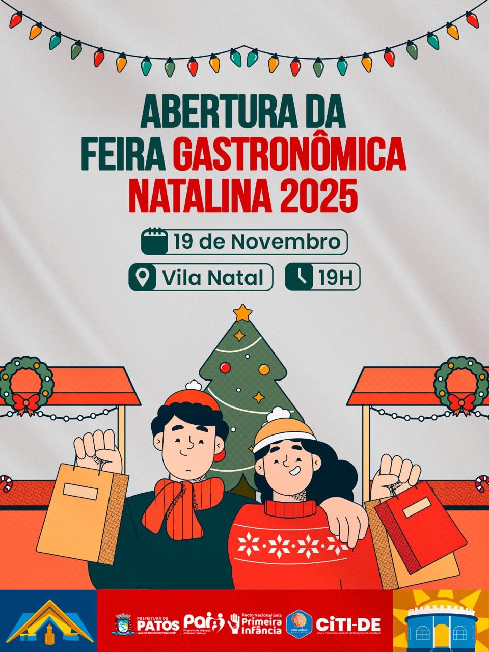 A Prefeitura de Patos, por meio da Secretaria de Ciência, Tecnologia, Inovação e Desenvolvimento Econômico promove nesta quarta-feira, 19, a abertura da Feira Gastronômica Natalina 2025, ao lado da igreja de Nossa Senhora da Conceição, dentro da programação do Natal da Gente. O espaço contará com barracas padronizadas, opções de doces e salgados finos, além de decoração temática que reforça o clima natalino na cidade.