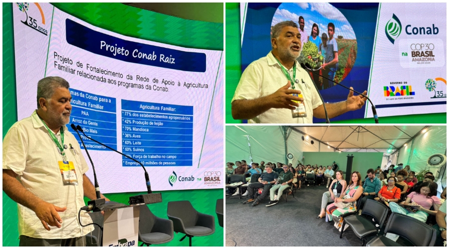 O diretor de Desenvolvimento, Inovação e Gestão de Pessoas da Companhia Nacional de Abastecimento (CONAB), Lenildo Morais, apresentou nesta terça-feira (19), no Auditório 1 da Agrizone, as principais estratégias da instituição para ampliar a inovação tecnológica voltada à agricultura familiar. A participação integrou a programação oficial da COP30, reforçando o compromisso do Brasil em promover sistemas alimentares sustentáveis e resilientes às mudanças climáticas.