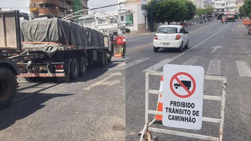 Apesar da sinalização existente no giradouro que liga a Rua Peregrino Filho à Rua Presidente Floriano Peixoto — onde placas indicam a proibição de circulação de caminhões — o motorista entrou no trecho e acabou ficando impedido de avançar por causa dos arcos de alerta instalados para proteger a estrutura de iluminação natalina.