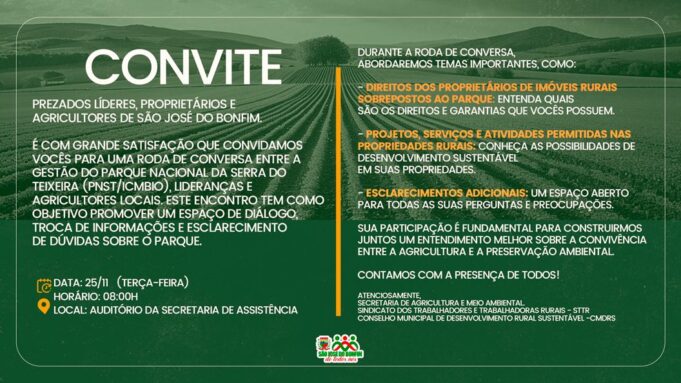 É com grande satisfação que convidamos vocês para uma Roda de Conversa entre a Gestão do Parque Nacional da Serra do Teixeira (PNST/ICMBio), lideranças e agricultores locais. Este encontro tem como objetivo promover um espaço de diálogo, troca de informações e esclarecimento de dúvidas sobre o Parque.