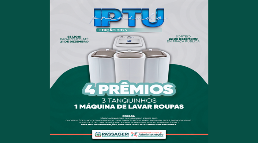 A Prefeitura de Passagem, na Região Metropolitana de Patos, reforça a todos os moradores que a campanha IPTU Premiado 2025 está chegando ao seu grande momento! No dia 22 de dezembro, em praça pública, serão sorteados quatro prêmios especiais para os contribuintes que estiverem com o pagamento do IPTU em dia.