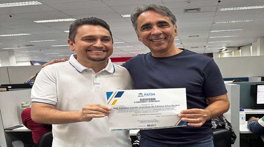 Guilherme Noronha Luz, um dos sócios-fundadores e acionista da AeC, recebeu juntamente com Luciana Borba, que é representante local da empresa, o certificado “Amigo da Juventude”, iniciativa da Prefeitura de Patos, por meio da Secretaria de Juventude. A honraria é concedida a personalidades e instituições que contribuem de forma significativa para políticas voltadas ao público jovem.