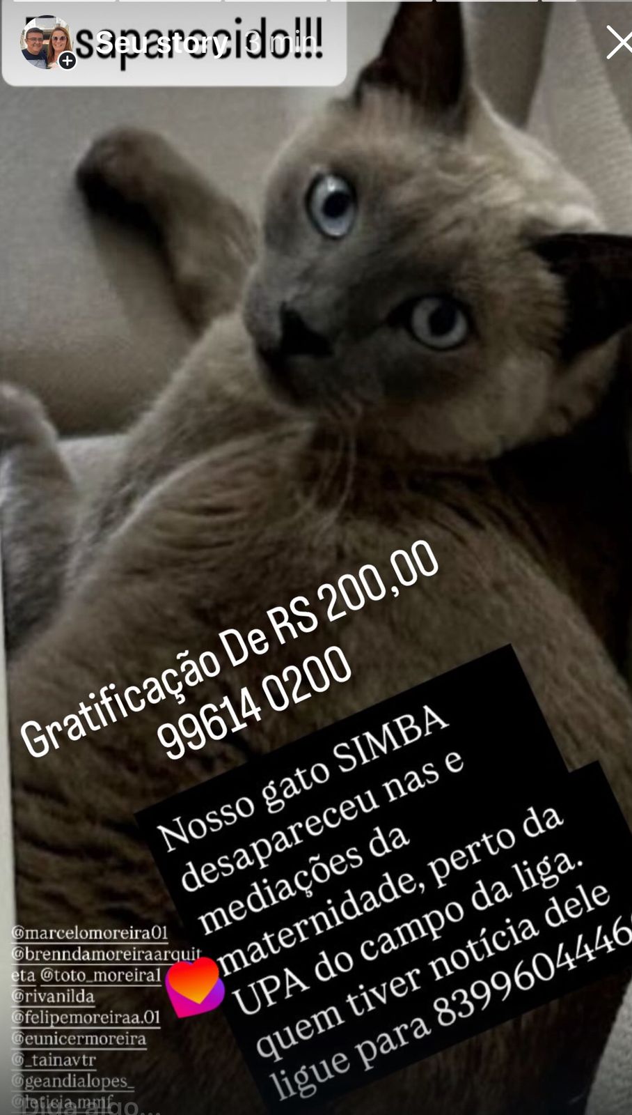 A senhora Brennda Moreira está oferecendo R$ 200 de recompensa para quem encontrar e devolver o seu gatinho que atende pelo nome Simba, que sumiu neste domingo, 07/12, nas proximidades da UPA do Campo da Liga, no Bairro da Maternidade, em Patos.
