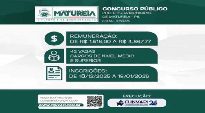 O certame, organizado pela FUNVAPI, oferece oportunidades para níveis médio, técnico e superior com salários de até R$ 5.000,00. A Prefeitura Municipal de Matureia, na Região Metropolitana de Patos, comunica o lançamento do Edital nº 01/2025, referente à realização de Concurso Público destinado ao preenchimento de vagas efetivas no quadro de servidores municipais.