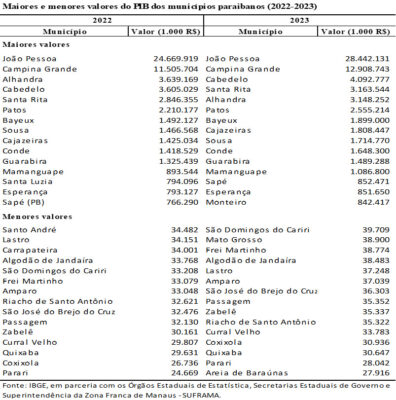 Os cinco municípios com o PIB da Paraíba não mudaram entre 2022 e 2023, entretanto, uma posição se inverteu. Antes, Alhandra ocupava o terceiro lugar, enquanto Cabedelo era o quarto. Agora Cabedelo é terceiro e Alhandra o 5º.