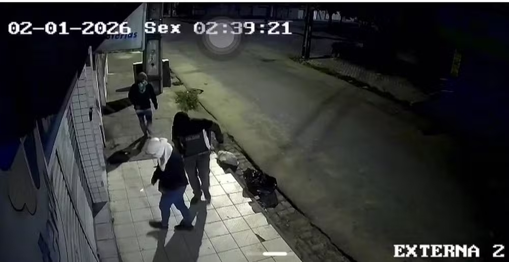 Nas imagens, é possível ver quando três suspeitos encapuzados chegam andando e arrombam o portão com uma espécie de barra de ferro.