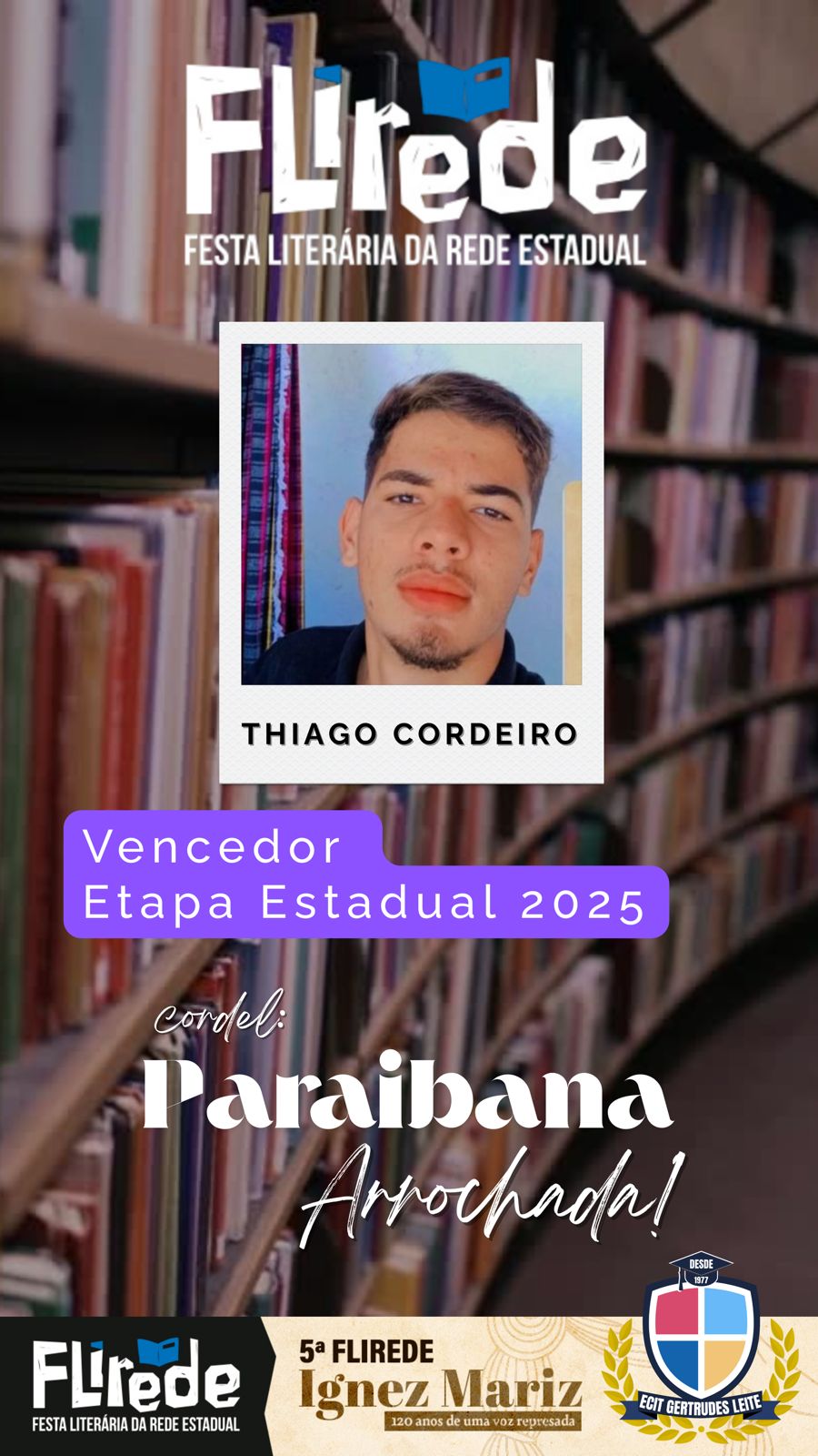 A ECIT Gertrudes Leite, em Desterro, na Região Metropolitana de Patos, tem mais um grande motivo para comemorar! O estudante Thiago Cordeiro foi consagrado Vencedor da Etapa Estadual 2025 da FLIREDE – Festa Literária da Rede Estadual, na categoria Cordel, com a obra “Paraibana Arrochada!”.