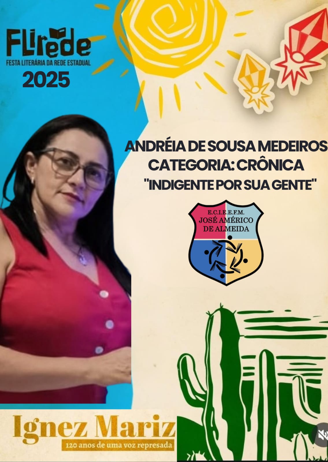 A professora Andréia de Souza Medeiros, da ECIT José Américo de Almeida, localizada no município de São José de Espinharas, na Região Metropolitana de Patos, foi selecionada para representar a 6ª Gerência Regional de Educação (6ª GRE) por meio do concurso da FLIREDE, com a crônica “Indigente por sua gente”.
