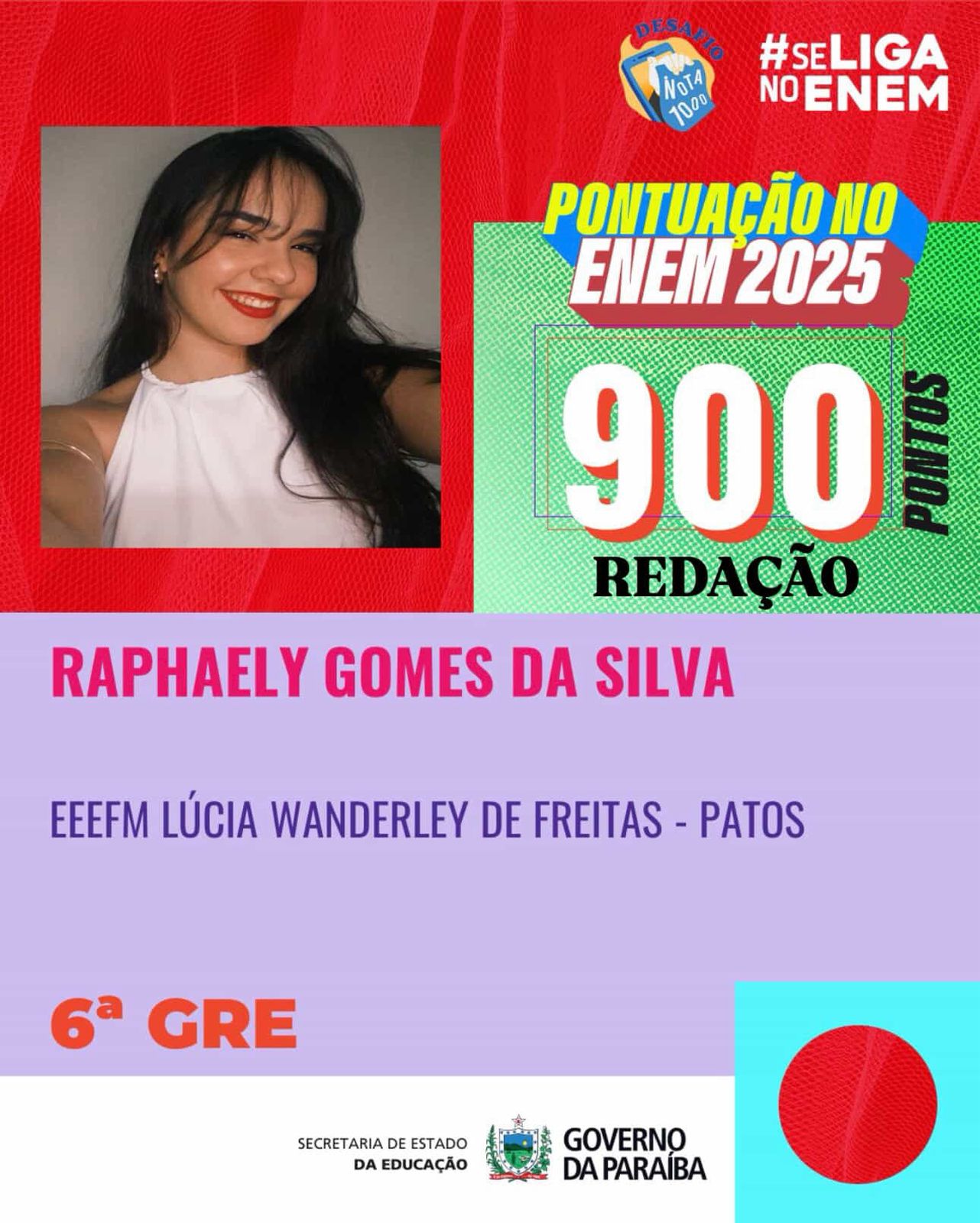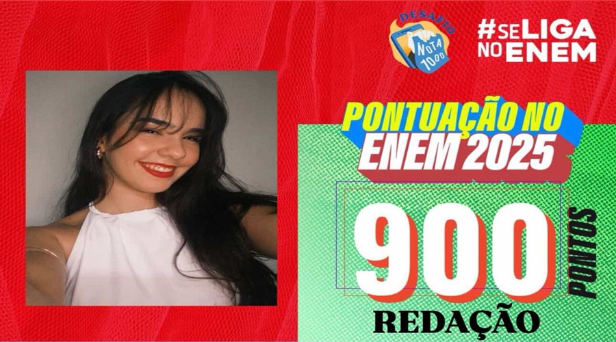 A estudante Raphaely Gomes da Silva, de 18 anos, que reside no distrito de Santa Gertrudes, em Patos, alcançou 900 pontos na redação do Enem 2025, cujo tema foi “Perspectivas acerca do envelhecimento na sociedade brasileira”.
