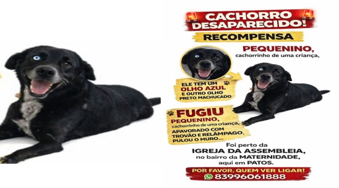 Está desaparecido há 15 dias um cachorro chamado Pequenino. Ele é de porte médio, preto com o peito branco e tem uma característica bem marcante: um olho azul e o outro escuro e machucado, precisando de colírio diariamente.